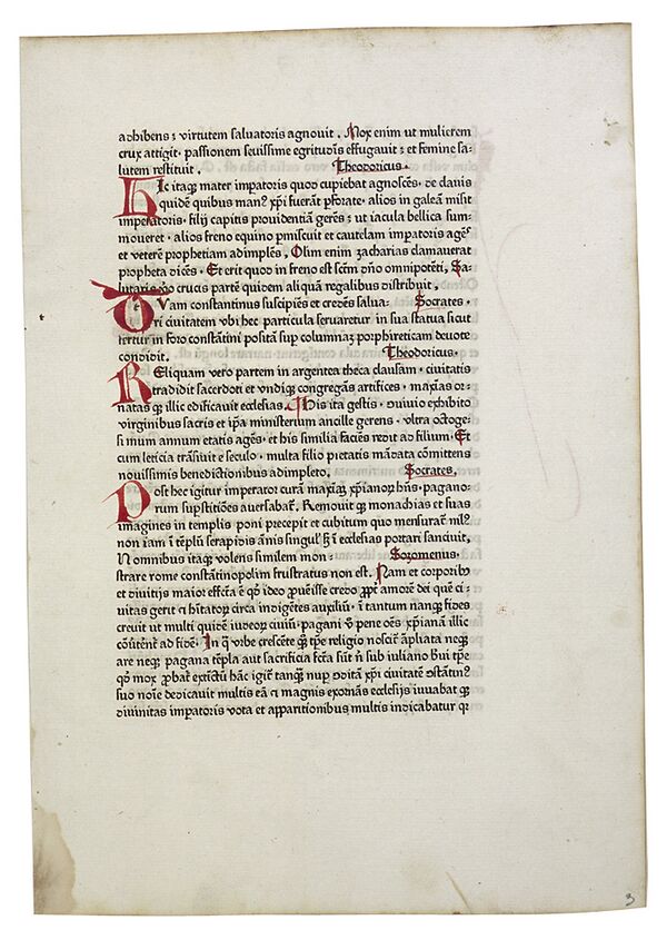 - История в трёх частях (лат. Historia ecclesiastica tripartita) в 13 книгах — компилятивное изложение событий от начала времён и до современных Кассиодору. Одно из наиболее популярных сочинений Кассиодора в Средние Века — сохранилось 138 рукописей[56], в том числе 6 — каролингской эпохи. В основу компиляции положены переводы с греческого трудов Сократа Схоластика, Феодорита Кирского и Созомена; они были выполнены Епифанием Схоластиком.