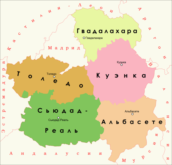 | Толедо | Толедо | 711 228 | 15 370 | Ла-Кампана-де-Олопеса, Ла-Хара, Манча-Альта-де-Толедо, Меса-де-Оканья, Ла-Сагра, Монтес-де-Толедо, Сьерра-де-Сан-Висенте, Талавера-де-ла-Рейна, Толедо, Торрихос | 204 |