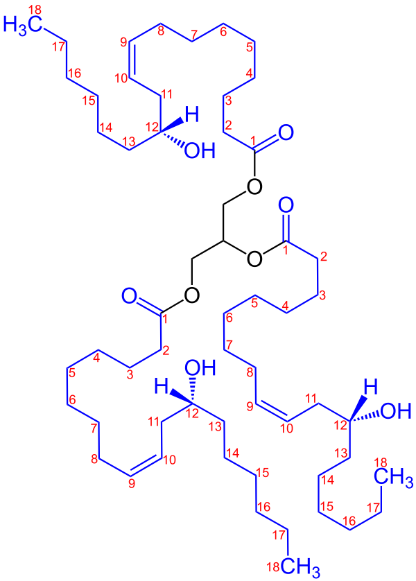 Известное слабительное средство. При приёме внутрь в тонком кишечнике расщепляется липазой, в результате чего образуется рицинолевая кислота, вызывающая раздражение рецепторов кишечника (на всем его протяжении) и рефлекторное усиление перистальтики[6]. Эффект после использования слабительного наступает не сразу, а после нескольких часов.[7]
