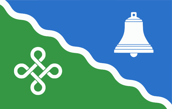 Флаг: полотнище поделено наклонной белой волнистой полосой на синюю и зелёную части, на зелёной части белый петлеобразный четырёхсторонник, на синей части белый колокол. Нормальные размеры флага 105 x 165 см, соотношение ширины и длины 7:11[9].
