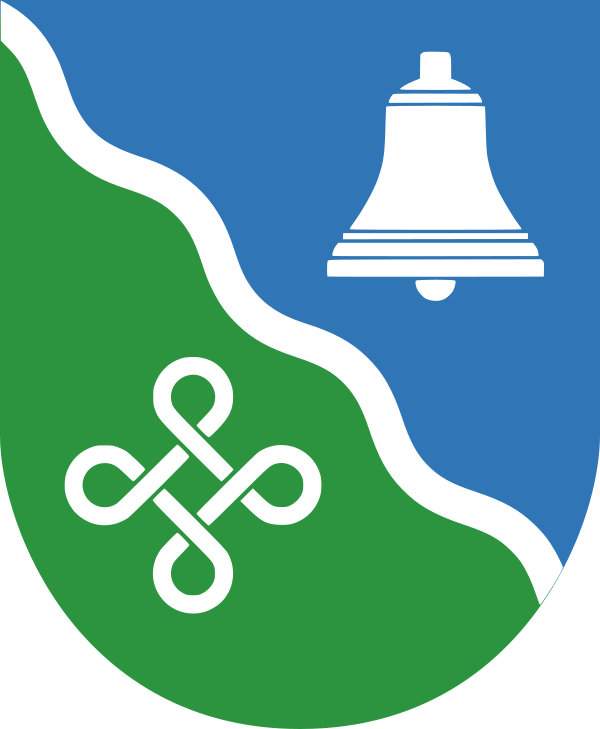 Герб: геральдический щит поделён наклонной серебристой волнистой полосой на синюю и зелёную части; на зелёной части серебристый петлеобразный четырёхсторонник, на синей части серебристый колокол.