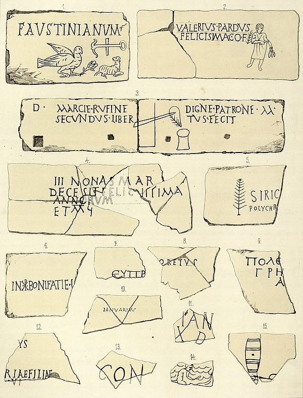 Множество надписей встречается на локулах на латинском и греческом (греч. ZOE — «жизнь») языках. Иногда латинские слова написаны по-гречески, или в одном слове встречаются буквы из этих языков. В катакомбных надписях встречаются названия видов захоронений: arcosolium (arcisolium, arcusolium), cubiculum (cubuculum), forma, имена фоссоров, описание их деятельности.