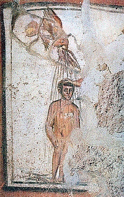 | Крещение | Часто встречающееся изображение в катакомбной живописи. Существует в двух вариантах: евангельский рассказ о Крещении Господнем от Иоанна Предтечи и просто изображение таинства крещения. Главным отличием между сюжетами выступает символическое изображение Святого Духа в виде голубя на фресках Крещения Господня. | |