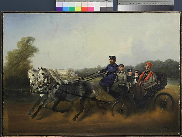 | Катание в коляске. Александр II с сыновьями на прогулке в Царском Селе. 1850 | |