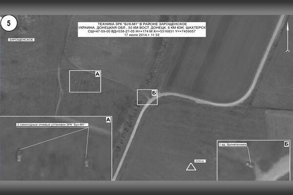 Российскими силовыми ведомствами был обнародован целый ряд сведений, относящихся к обстоятельствам и возможным причинам катастрофы малайзийского самолёта. Так, через четыре дня после катастрофы 21 июля 2014 года Министерство обороны России провело специальный брифинг для представителей СМИ на котором, в частности, были обнародованы данные воздушной обстановки в районе катастрофы, полученные с трёх радиолокационных станций системы организации воздушного движения и Минобороны России, а также спутниковые снимки дислокации самоходных огневых установок зенитных ракетных комплексов «Бук-М1» Вооружённых сил Украины, способных поражать цели на дальности до 35 километров и на высотах до 22 километров, вместе с картой размещения украинских средств противовоздушной обороны в районе пролегания коридора международной воздушной трассы. Космические снимки отдельных мест расположения средств ПВО украинской армии, как утверждал на брифинге заместитель министра обороны России Андрей Картаполов, были сделаны 14, 17 и 18 июля в районе 8 километров северо-западнее Луганска (самоходная установка и две пускозаряжающие машины) и вблизи Донецка (радиолокационные станции). На основании сопоставления снимков утверждалось, что к утру 17 июля одна батарея ЗРК «Бук» была переведена в район населённого пункта Зарощенское, что в 50 км восточнее Донецка и в 8 км южнее Шахтёрска, вблизи контролируемой повстанцами территории.