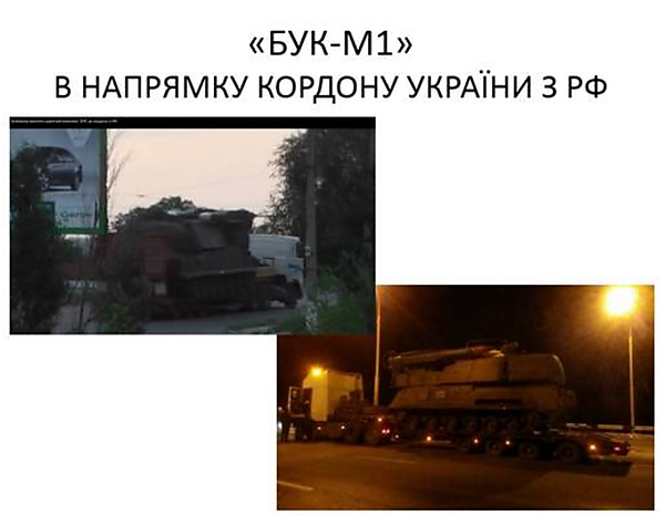 Тогда же, 18 июля, министр внутренних дел Украины Арсен Аваков опубликовал на своей странице в Facebook видео, на котором, по его словам, был предположительно заснят тот самый ракетный комплекс «Бук», из которого стреляли по малайзийскому самолёту. Размещённое видео Арсен Аваков сопроводил следующим комментарием: «Подразделениями скрытого наблюдения МВД Украины сегодня, 18 июля, в 4:50 утра зафиксирован тягач с загруженным гусеничным ракетным комплексом, двигающийся через Краснодон, в сторону границы с Российской Федерацией. На видеозаписи видны расчехлённые ракеты. Две ракеты на месте — средняя не просматривается».