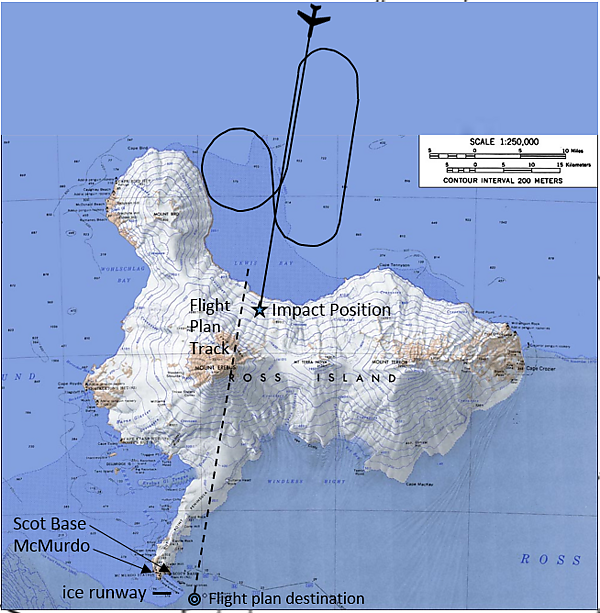 В ходе расследований выяснилось, что утвержденный план полёта предполагал, что маршрут должен пролегать от мыса Халлетт до всенаправленного маяка (NDB) Мак-Мёрдо. Этот маршрут проходил непосредственно над 3800-метровым пиком горы Эребус. Однако из-за опечатки в географических координатах план полёта, который использовался во всех предыдущих экскурсионных полётах, отличался от утверждённого и проходил примерно в 43 километрах западнее Эребуса[7]. Такой же план был представлен экипажу командира Коллинса на брифинге перед полётом. Накануне вылета авиакомпания была проинформирована о навигационной ошибке КВС предыдущего рейса. В план полёта были внесены изменения, но экипажу об этом не сообщили. После этих изменений маршрут проходил не в стороне от горы, как думал экипаж, а над её вершиной.