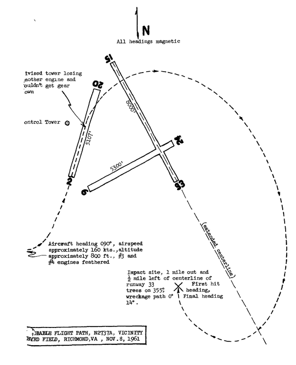 Можно обратить внимание, что когда в 21:12 экипаж в первый раз связывается с диспетчерской вышкой Ричмондского аэропорта, авиалайнер уже летит лишь на двух работающих левых двигателях. При этом у экипажа, на протяжении как минимум 8 минут после доклада о следовании в Ричмонд, не было проблем с пилотированием самолёта, несмотря на дисбаланс тяги, создающего разворачивающий момент. За это стоит отдать должное создателям модели L-049, к которой относился борт N2737A, так как её разрабатывали с условием возможности выполнения полёта на двух оставшихся рабочих двигателях, даже если оба они расположены на одной стороне крыла (пункт 4b «Положений гражданской авиации»)[17].