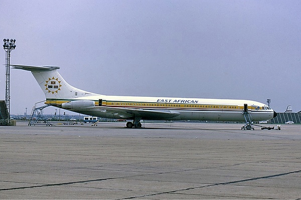 В 1965 году африканская авиакомпания East African Airways (совместное авиапредприятие Кении, Танзании и Уганды) искала новый реактивный самолёт, который должен был заменить на межконтинентальных рейсах лайнеры de Havilland Comet. Выбор был между американскими Boeing 707 и Douglas DC-8 и британским Vickers VC10; так как Великобритания согласилась оказать финансовую помощь, авиакомпания закономерно выбрала последний вариант. Новые самолёты относились к модели Super VC10-1154, имевшей увеличенную длину фюзеляжа, и отличались от аналогичных (в британских авиакомпаниях) наличием большой грузовой двери на левом борту. Всего в 1965 году изначально были заказаны три Vickers VC10 — первый (борт 5X-UVA) был зарегистрирован в Уганде, второй (борт 5H-MMT) в Кении, а третий (борт 5Y-ADA) в Танзании. К 1970 году East African Airways заказала ещё два Vickers VC10 — борта 5X-UVJ и 5H-MOG[1].
