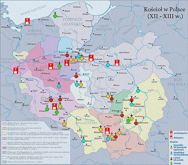 В 1375 году была основана Митрополия Львова в составе Архиепархии Львова, Епархий Перемышля, Перемышля, Хелма, Владимира-Волынского (с 1428 года - Луцка), Каменца, Киева и Сирета (с 1591 года - Бакова), в рамках Митрополии Гнезно были основаны епархии Вильно и Жмуди. С начала XVI до середины XVII века Польша пережила Реформацию. Однако Реформация в Польше коснулась лишь магнатов и средних слоёв и не имела влияния на крестьянское население. Реформационные течения были представлены лютеранством, кальвинизмом, а также движением Польских братьев, которые исповедовали арианские идеи. Реформация оказала значительное влияние на развитие литературы и образования на польском языке.