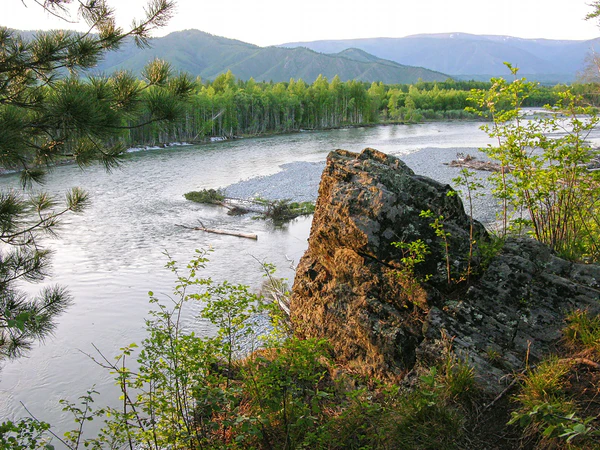 Нижняя Катунь, от Большой Сумульты до устья, располагается в области среднегорья и низкогорья. Общее падение реки — около 400 м. Преобладающий характер долины — всё более широкое развитие террас. Из притоков на этом участке наиболее значительными являются реки Чемал[10] и Сема[11]. Склоны долины заняты, в основном, лиственницей. Начиная от устья Сумульты появляется сосна.