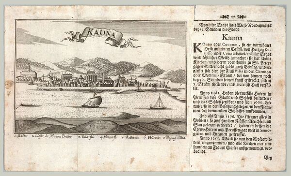 Первая известная запись названия города на литовском языке относится к 1656 году: в списках лиц, принявших присягу на верность в Пруссии, бывшая жительница города Густене Мачюлайтене подписалась как «вдова из Каунаса» («Gustene maczulaitene naszle isz kauno»)[7].