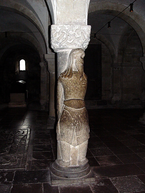 Крипта осталась в значительной степени нетронутой начиная с его освящения в 1123 году. Крипта украшена многочисленными столбами, которые отличаются по стилю. Столбы были построены архитектором Донатусом. Самый известный столб имеет статую человека, охватывающего его. Местная легенда говорит, что эта фигура — Финнтролль, строитель собора. Другой столб имеет подобную скульптуру женщины, жены Финнтролля, согласно легенде. На самом деле, неизвестно, кто именно эти мужчина и женщина.