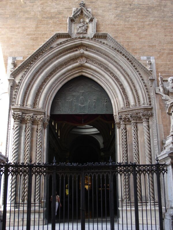 Западный портал собора имел первоначально деревянные створки, но в 1961 году они были заменены на бронзовые, работы Филиппо Сгарлата. В табернакле над порталом помещена ценная статуя Мадонны XV века[7].
