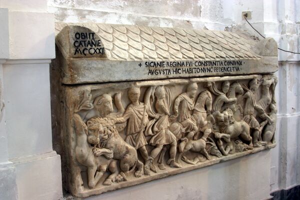 Непроста история этих захоронений. Рожер II в своём завещании указал местом своего погребения собор Чефалу, куда заблаговременно в 1145 году были помещены два массивных порфировых саркофага, богато украшенных резьбой. Тем не менее, после кончины Рожера II его наследник принял решение похоронить отца в столичном соборе, а не в провинциальном Чефалу. Изготовленный для Рожера II палермитанский саркофаг значительно проще надгробий Чефалу, его единственным украшением являются опоры из белого мрамора в виде коленнопреклонённых юношей. После внезапной кончины Генриха VI его вдова Констанция заказала для покойного супруга надгробие по образцу находящихся в Чефалу, но изготовленный поспешно в 1197 году саркофаг был не цельным, а склеенным из четырнадцати отдельных частей. Наконец в 1215 году сын Генриха VI и Констанции Фридрих II приказал перевести из Чефалу в Палермо остававшиеся пустыми саркофаги 1145 года, в один из них он перенёс останки своего отца, а в другом завещал похоронить собственную особу (последнее и было выполнено в 1250 году). В «освободившуюся» при этом гробницу 1197 года было помещено тело матери Фридриха II. В завершение этой чехарды после внезапной кончины короля Педро II его тело было помещено в усыпальницу Фридриха II, так что останки Фридриха II и его праправнука покоятся в одном саркофаге. При вскрытии саркофага Фридриха II в XIX веке выяснилось, что помимо Фридриха II и Педро II здесь находятся кости третьей персоны — женщины, причём принадлежность этих останков остаётся невыясненной до сих пор[3].