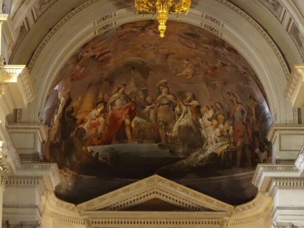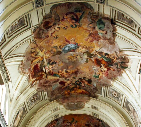 Поверхность главной апсиды украшена двумя фресками конца XVIII века, изображающими Вознесение Богородицы и освобождение храма от арабов Робертом Гвискаром и Рожером I. Выполненные в свойственной своему времени манере фрески наполнены фигурами розовощёких пухлых ангелов и облачённых в классические древнеримские тоги и шлемы архангелов и христианских воинов. Этими фресками заменили по решению Фуга мозаики норманнского периода и ретабло Гаджини. Статуи святых из уничтоженного ретабло были, тем не менее, сохранены и установлены перед пилонами, делящими пространство собора на нефы[7].