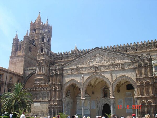 В XIV—XVI веках сооружение собора Палермо продолжилось. В 1342 году были завершены четыре угловые башни собора, а в 1352 году сооружён главный (западный) портал собора в готическом стиле[7]. В период с 1426 по 1430 годы по проекту Антонио Гамбара был сооружён южный портик собора с тремя стрельчатыми арками, выдержанный в стиле каталанской готики[7]. В это же время над южным порталом собора тем же Антонио Гамбара была помещена мозаичная икона Богородицы на Троне. Позднее, в том же XV столетии, на примыкающей к южному фасаду собора площади (Соборная площадь — Piazza Cattedrale) по повелению архиепископа Симоне да Болонья был разбит сад[7]. В это время собор обрёл свои наиболее известные святыни: статую Madonna Libera Inferni (1469 год) и мощи святой Розалии (1624 год)[4].