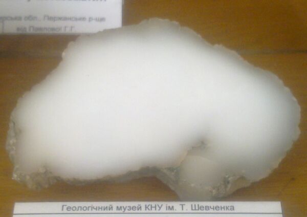Молочно-белый камень, плотный опалоподобный агрегат, похожий на фарфор. Его называют «жемчужный опал», «калмыцкий жемчуг», «полуопал». Прекрасно полируется, имеет матовые оттенки.