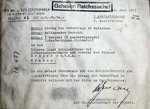 Между тем дальнейшее «переселение» требовало больших усилий, для того чтобы с 23 июня 1943 года многие еврейские округа были уже распущены. Таким образом, дистрикт Галиция стал свободным от евреев, за исключением тех, которые находились в лагерях под контролем руководителей СС и полиции. С всё ещё оставшимся небольшим количеством евреев полиция порядка и жандармерия обошлась «особым образом». До 27 июня 1943 года было «выселено» в общей сложности 434 329 евреев[3].