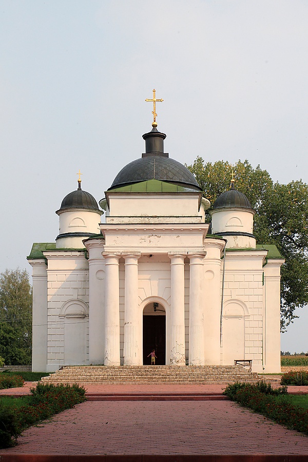 Усадебная церковь посвящена святому Георгию Хозевиту. Выстроена в 1817—1828 годах в стиле позднего классицизма. Стены выложены из кирпича, руст на фасадах густо забелён без выделения архитектурных деталей. Крестообразная в плане с удлинённой западной частью, с полукруглой апсидой и угловыми прямоугольными в плане камерами, равными по высоте основному объёму. Западный портал акцентирован четырёхколонным портиком со спаренными колоннами, над которым расположен антаблемент с триглифами во фризе. Отверстия прямоугольные и полуциркульные, декорированные пилястрами, сандриками, архивольтами. Центральная часть здания покрыта куполом, в западной части церкви — хоры, на которые ведёт винтовая лестница в толще стены. Над апсидой — конха.[36]