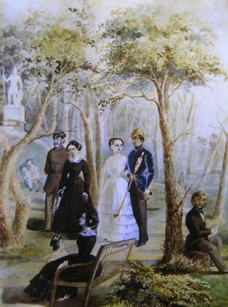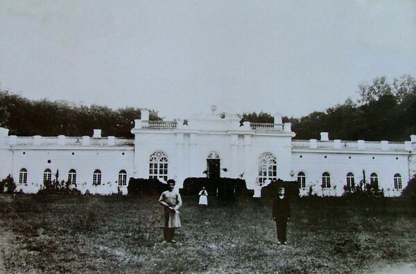 …Подъезжали к поместью с нескольких сторон по стройным аллеям из пирамидальных тополей; дом большой каменный, стоял на возвышении; огромный, прелестно раскинувшийся сад с прудами и вековыми кленами, дубами и липами величественно ласкал зрение. Но осмотрясь, удивление уменьшалось: дом был как будто не окончен, дорожки в саду не доделаны. Был у владельца оркестр, и не дурной оркестр, но не полный и духовые инструменты не все исправны… Одним словом все обличало излишнюю расчётливость бездетного хозяина, владевшего 9000 душ и большим капиталом