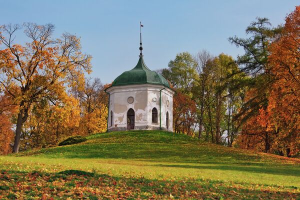 Под павильоном в толще холма находится грот с сводом, с декоративными нишами и пристеночной лестницей. Подвал имеет четыре дверных проёма, три из которых заложены. Перед входами находятся трапециевидные площадки, ограниченные подпорными стенами, построенными по срезу холма. Общая высота павильона (с подвалом) 16 метров.[35]