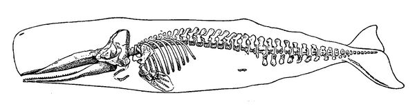 В позвоночнике кашалота насчитывается 7 шейных позвонков, 11 грудных, 8—9 поясничных и 20—24 хвостовых. В отличие от прочих китообразных, у кашалотов первый позвонок (атлант) остаётся свободным, тогда как остальные шесть шейных позвонков срастаются между собой[28]. В передней конечности, превращённой в плавник, пять пальцев; плечевая кость иногда срастается с локтевой и лучевой. Узкая лопатка (в отличие от усатых китов, у которых лопатка веерообразная) имеет большой коракоидный отросток. Рёбер до 11 пар, из которых только три соединены с грудиной[23].