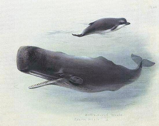 …у побережья Галлии встречается огромная рыба — кашалот (Physeter), который, поднимаясь над водой, словно огромная колонна, делается выше корабельных мачт и изрыгает громадные потоки воды, такие мощные, что они могут потопить и разрушить судно.