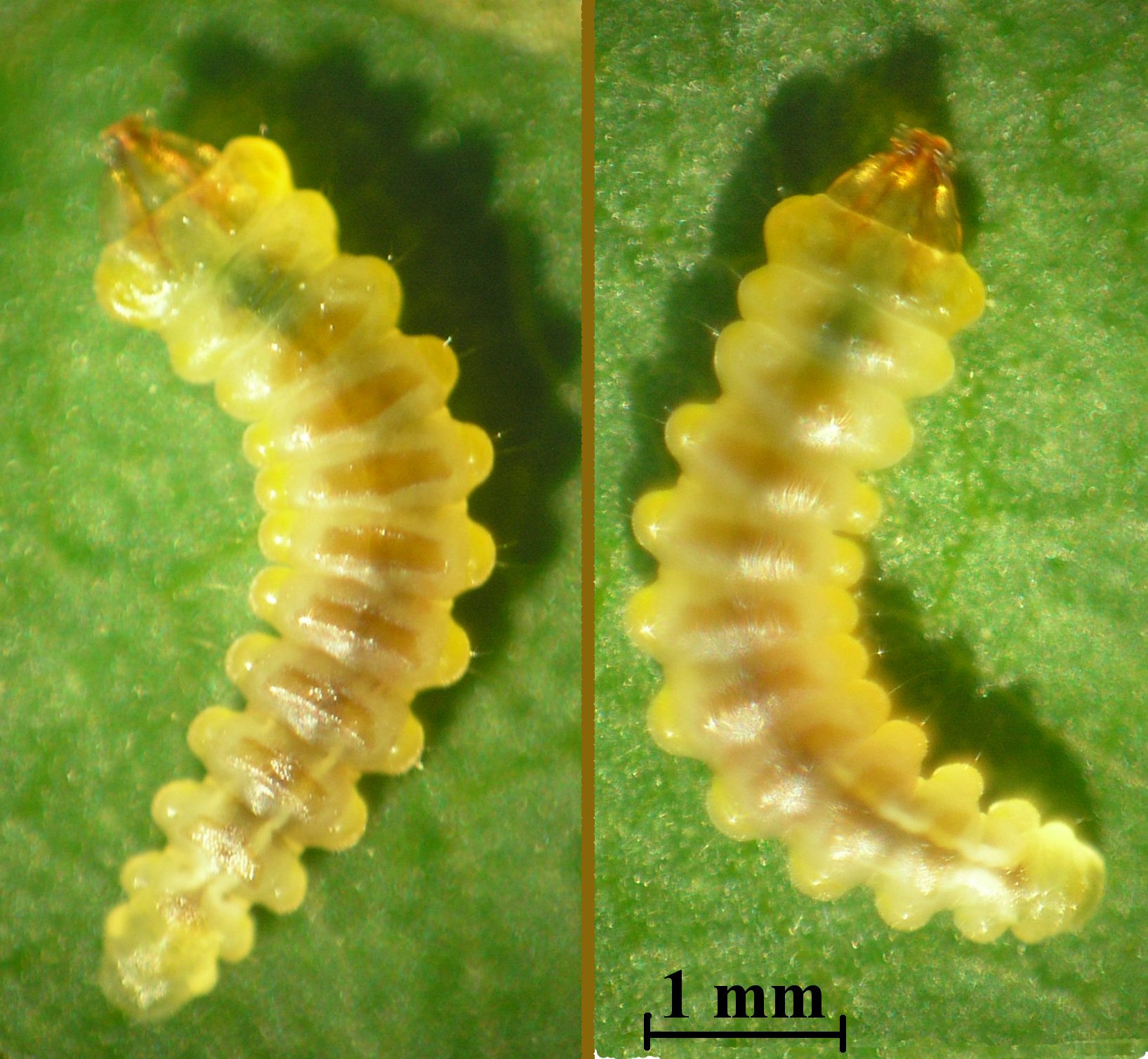 Гусеница первого возраста длиной 0,8 мм, светло-зелёная, полупрозрачная[21]. Тело уплощённое, к заднему концу сильно суженное. Первый грудной сегмент широкий (примерно 0,2 мм), заметно шире остальных сегментов груди. Головная капсула длиной 0,1—0,15 мм и шириной 0,11—0,2 мм, золотисто-коричневая, почти прозрачная[21].