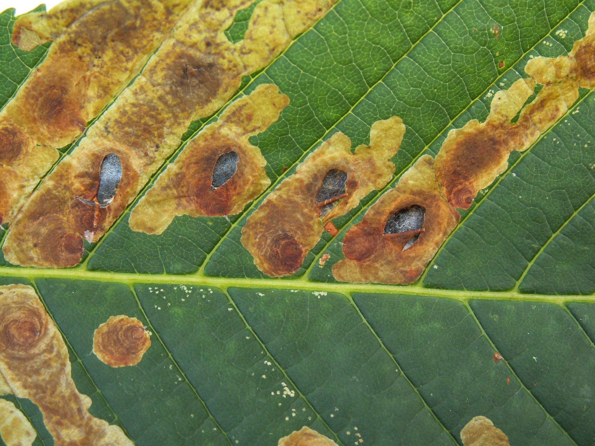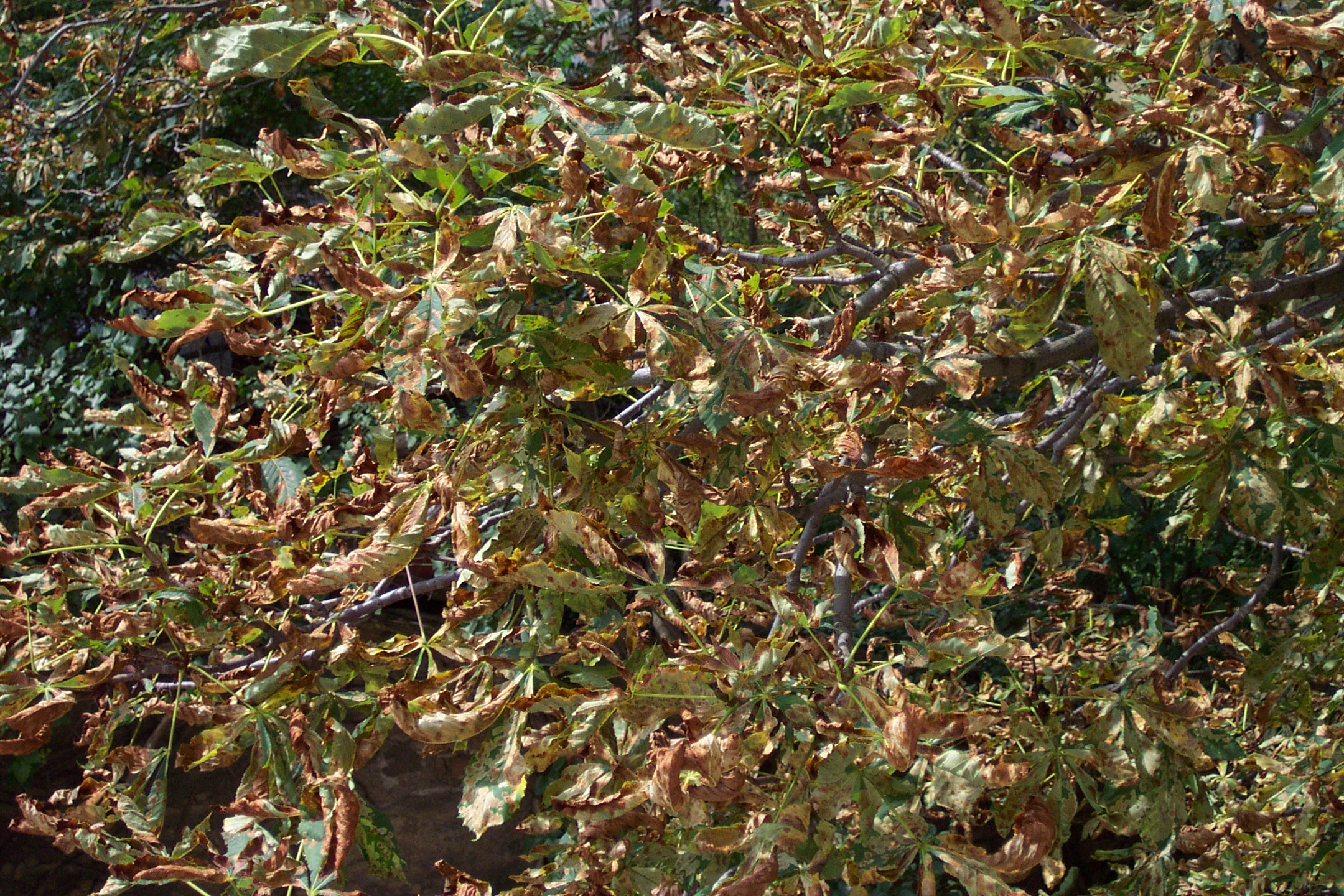 Слева-направо: гусеница возле своей листовой мины; мины с открытыми коконами, которых покинули моли; листва конского каштана, поражённая гусеницами моли; последствия инвазии гусеницами конских каштанов