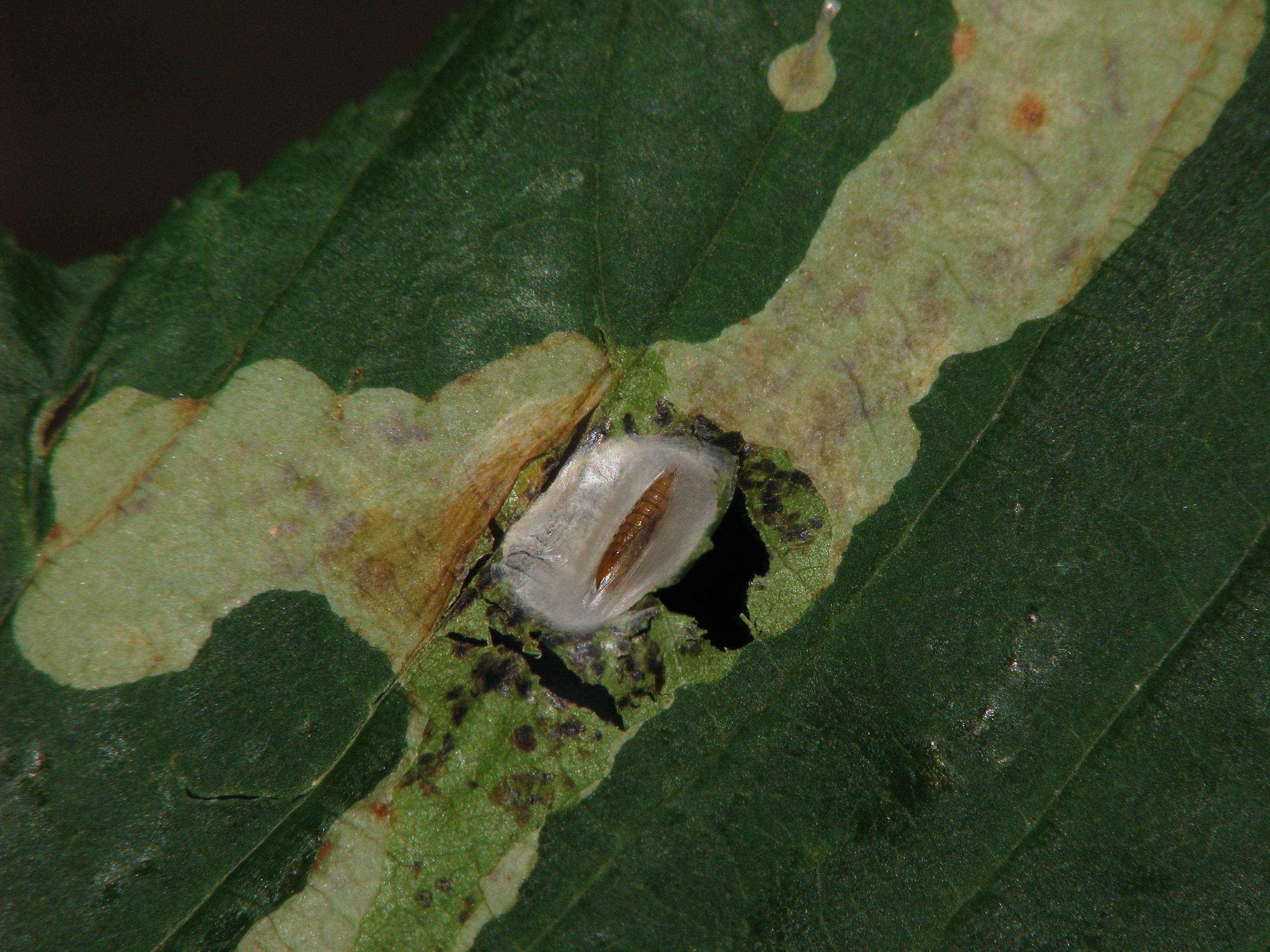 Появившись из яиц, гусеницы первого возраста проникают под кутикулу в эпидермальный слой листа кормового растения. Там они начинают поглощать сок, обычно проделывая прямой, слегка изогнутый ход вдоль жилки. Этот ход в эпидермальной части серебристого цвета, длиной 0,7—1,5 мм и шириной 0,3—0,5 мм[21]. Экскременты гусеницы на этом участке мины проявляют на ней чёрную центральную линию (шириной 0,05 мм в начале и 0,08 в конце), которая образована отделами, соединёнными между собой пятнами. Затем гусеница в эпидермальном слое листа образует пятновидную мину диаметром 1 мм, где приступает к линьке. В этом месте линия экскрементов образует пятновидную часть неправильной сферической формы. Иногда пятновидная часть мины бледно-коричневая. Гусеницы, образующие такие мины, уже могут приступать к питанию соком клеток верхнего слоя пластидной паренхимы[21].