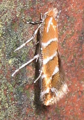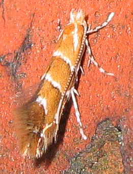 Длина тела бабочки — 6—7 мм, размах крыльев 7—9,5 мм[3]. Голова покрыта красноватыми волосками. Усики последним члеником почти достигают вершины передних крыльев. Грудь почвенного цвета. Передние крылья красновато-коричневые, с белыми базальными линиями, двумя изогнутыми наружу белыми линиями, которые с внешней стороны тонко окаймлены чёрной полоской, и двумя парами изогнутых костальных и дорсальных линий. Апикальная часть (вершина) передних крыльев беспорядочно усыпана черноватыми чешуйками. Задние крылья и брюшко серые. Ноги белые в чёрных точках[3].