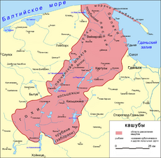 Современная территория Кашубии занимает восточную часть Поморья (в прошлом Поморье было полностью заселено славянами, в XII—XIII веках их ареал достигал на западе реки Парсенты и города Колобжега)[20]. С момента завоевания Поморья немцами в течение нескольких сотен лет область распространения поморских диалектов и численность их носителей постоянно сокращались, к началу XX века единственными оставшимися представителями поморян были кашубы, они составляли большинство только на Гданьском Поморье. На части своей этнической территории, в основном в небольших анклавах среди сплошного ареала с немецкоязычным населением (в Слупском, Бытувском, Лемборкском, Члухувском и Мястецком повятах в Западной Пруссии), кашубы остались как меньшинство; на части — полностью подверглись германизации. Так, например, кашубы (включая словинцев и кабатков), жившие ещё в XIX веке в приморском поясе от озёр Лебско и Гардно до Жарновецкого озера, были онемечены полностью к середине XX века. Лишь только после Второй мировой войны территория расселения кашубов стала расширяться на запад (в Слупский, Бытувский и другие повяты) и на восток (на территорию бывшего Вольного города Гданьска)[24][25][26].