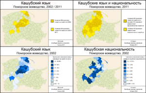 На протяжении почти всего XX века, особенно в польском языкознании, кашубский рассматривался преимущественно как диалект польского языка (при этом подчёркивалась его генетическая самостоятельность)[39], выражением этого взгляда было выступление польского лингвиста Кароля Дейны в 1991 году на конференции в Гданьске на тему «Языковой статус кашубского» (Status językowy kaszubszczyzny), на которой он, опираясь на работы таких диалектологов, как Казимир Нич, Здзислав Штибер и многих других, поддержал традиционную точку зрения о том, что кашубский является одним из польских диалектов. В то же время ряд учёных отстаивали иной взгляд, согласно которому кашубский представляет отдельный от польского лехитский язык[40]. Вопрос языкового статуса кашубского остаётся дискуссионным и до настоящего времени[41], тем не менее, с начала 1990-х годов всё шире начинает распространяться признание кашубского самостоятельным языком[~ 4]. И связано это не только с наличием у кашубского тех или иных лингвистических особенностей, отличающих его от польского языка[~ 5][40], но также и с отражающими процесс становления кашубского регионализма развитием кашубской литературы, распространением средств массовой информации на кашубском, использованием кашубского в школе и в церкви, с переводом на кашубский и изданием религиозной литературы, изданием словарей; появлением кашубских региональных организаций, ставящих целью в том числе и возрождение кашубского самосознания у носителей языка и т. д.[42] Наконец, в Польше кашубский язык получает правовой статус согласно закону от 6 января 2005 года о национальных меньшинствах и этнических группах, который определяет его как региональный язык[43]. Согласно этому закону, для охраны, развития и распространения кашубского языка стали выделяться средства как из государственного бюджета Польши, так и из бюджета Европейского союза, появилась возможность употребления кашубского языка в официальной сфере в качестве вспомогательного (język pomocniczy). Как вспомогательный (который употребляется при обращении в административные учреждения, в образовании, на официальных вывесках, указателях и т. д.) кашубский язык может быть введён в ряде гмин Поморского воеводства, в которых численность населения, продекларировавшего своим родным языком кашубский, согласно переписи населения 2002 года превышает 20 %[44][45]: