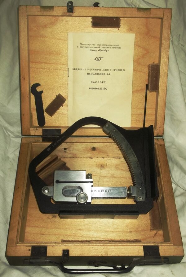 Квадрант состоит из рамки с взаимно перпендикулярными опорными площадками (размером 110х30 мм), зубчатого сектора, направляющей дуги и движка с ампулой.