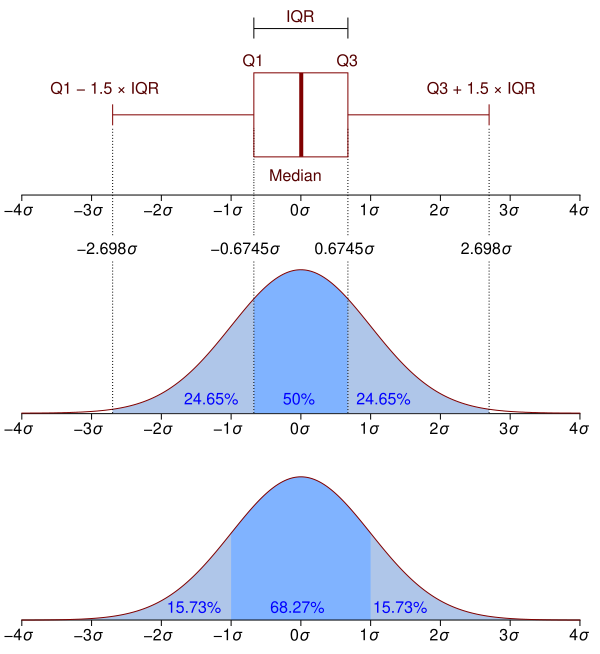 | Квантиль (округлённый до тысячных) | 3,719 | 3,090 | 2,326 | 1,999 | 1,960 | 1,645 | 1,282 | 1,000 | 0,000 |