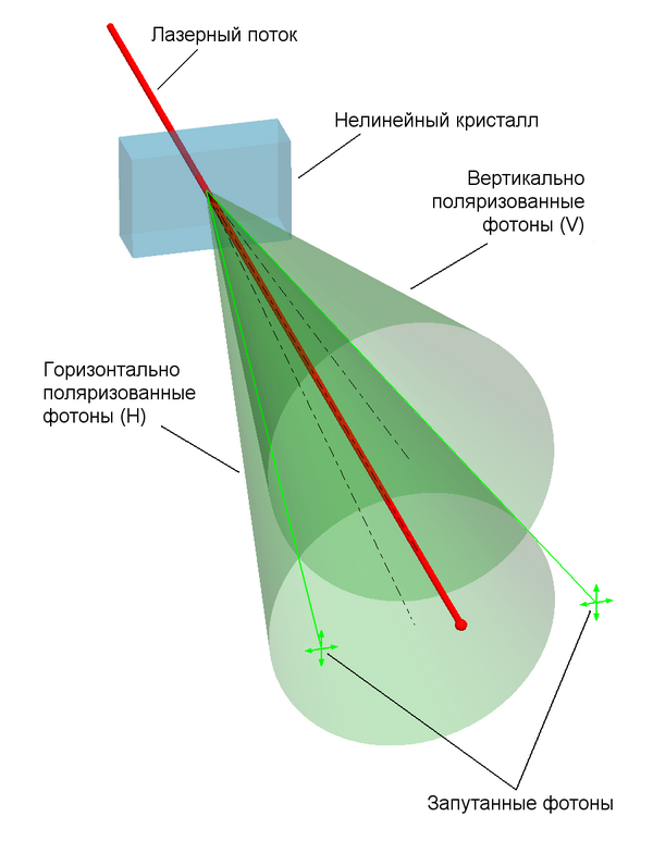 поэтому, если забирать один фотон бифотонной пары из одной линии пересечения конусов, то второй фотон можно всегда забрать из второй линии пересечения. В кристалле фотоны разных поляризаций распространяются с разной скоростью, поэтому в реальной экспериментальной установке каждый пучок дополнительно пропускается через такой же кристалл половинной толщины, повёрнутый на 90°. Кроме того, для нивелирования поляризационных эффектов, в одном из пучков вертикальная и горизонтальная поляризации меняются местами при помощи комбинации полуволновой и четвертьволновой пластинок. Создаваемые в результате СПР члены бифотонной пары можно обозначить индексами 1 и 2, при этом: