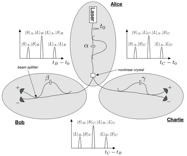 - Алиса: импульсный лазер, излучает в момент времени и попадает в интерферометр с неравными длинами траекторий так, что пучок разделяется на два различных импульса с одинаковой амплитудой. Одно плечо интерферометра содержит фазовращатель, сдвиг фазы обозначается как Импульсы фокусируются на нелинейном кристалле, на котором некоторые из фотонов пучка рассеиваются, образуя фотонные пары. Затем эти пары разделяются, одна из них отправляется Бобу, а другая — Чарли.