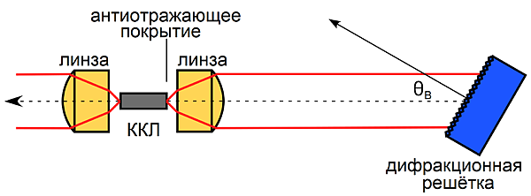В этом типе ККЛ полупроводниковая сверхрешётка по-прежнему играет роль усиливающей среды, но торцевые сколотые грани уже не играют роль зеркал резонатора. На одну либо обе торцевые грани нанесено антиотражающее покрытие. Настоящие зеркала, образующие резонатор, располагаются за пределами ККЛ. Внешний резонатор, содержащий частотно-селективный элемент, позволяет получить на выходе излучение с одной длиной волны и даже перестраивать её. Например, дифракционная решётка была использована для создания перестраиваемого ККЛ[34], который обеспечивал отстройку длины волны на 15 % от её центрального значения.