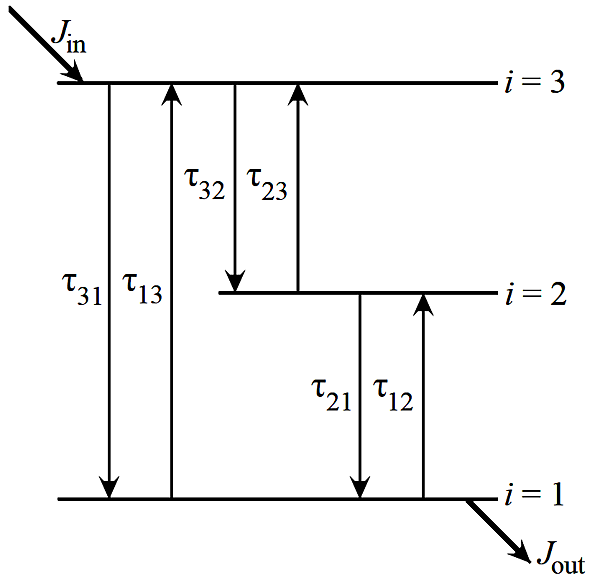 В стационарном состоянии производные по времени равны нулю, а инжектируемый ток равен вытекающему (). Обобщённое балансное уравнение для электронов на -ом уровне в -уровневой системе следующее: