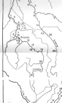 Волости: 1. Пильи Горы, 2. Перемская, 3. Чакола, 4. Пиринема, 5. Деревни по речке Немнюге, 6. Киглохта, 7. Старая Кеврола и Лохта; 8. Чухченема, 9. «На Шетогоре деревни», 10. Карпова гора, 11. Ваймуша, 12. Шардонема, 13. На Кушкополе, на Еркине, на Церкове горе; 14. Покшенга, 15. «На Марьиной горе», 16. Веркольская, 17. Лавела, 18. Сура, 19. Нюхча, 20. Выя, 21. Малая Пинежка.