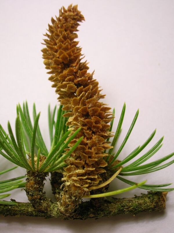 Колоски расположены одиночно на концах укороченных побегов, прямостоячие, окружённые при основании пучками хвои. Мужские колоски длиной около 5 см, с многочисленными, спирально расположенными почти сидячими тычинками, каждая из которых имеет по два сросшихся и растрескивающихся вдоль пыльника; пыльца с воздушными мешками.