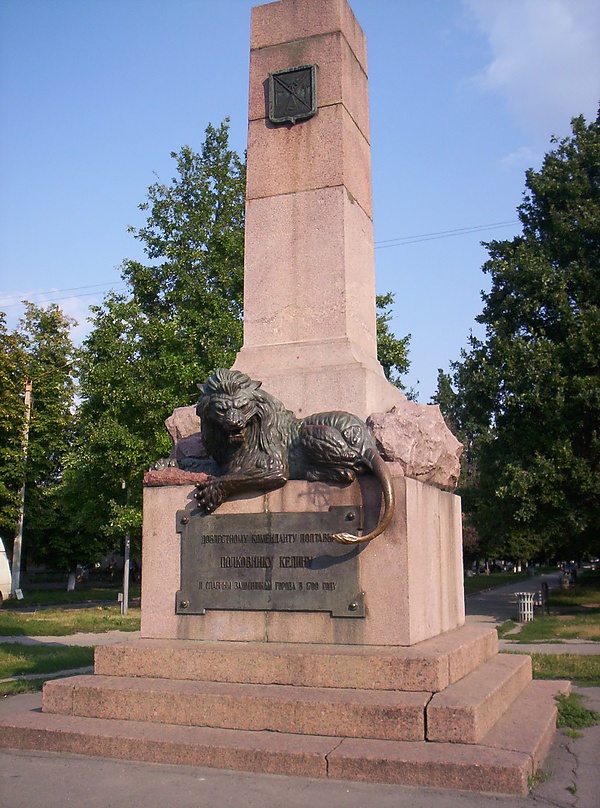 «Доблестному коменданту Полтавы полковнику Келину и славным защитникам города в 1709 году. 1-го апреля 1709 года Карл XII осадил Полтаву. Три месяца гарнизон и жители героически отбивали все атаки шведов. Последние ожесточённые штурмы отбиты доблестными полтавчанами 21 — 22 июня, после чего Карл XII снял осаду Полтавы.»
