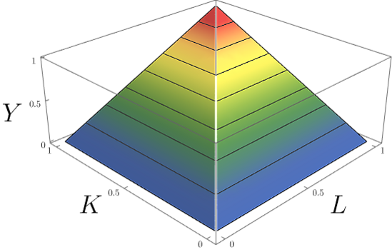 В неоклассической теории постулируется существование однозначной (функциональной) связи между задействованными в производстве «количествами» ресурсов (труда и капитала) и физическим (натурально-вещественным) объёмом продукции[2]. Часто рассматривается модель Солоу, в которой производственная функция может иметь вид