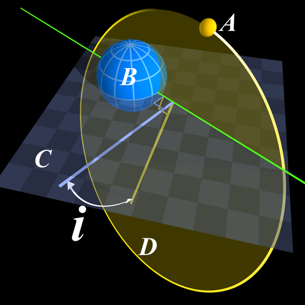 Обычно обозначается буквой i (от англ. inclination). Наклонение измеряется в угловых градусах, минутах и секундах.