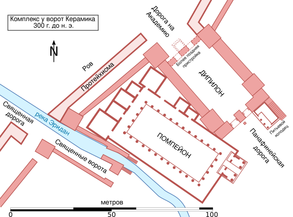 В период античной классики центром Керамика стал Помпейон — общественное здание, возведенное как часть городской стены четко по центру между двумя воротами. Помпейон был основным местом торжеств во время Панафинейского фестиваля. Собственно он был построен как большой банкетный зал, окруженный просторным двором с колоннадой. Гекатомба (жертвоприношение из ста быков) приносилась здесь и мясо раздавалось всем афинским гражданам именно здесь, в Керамике.