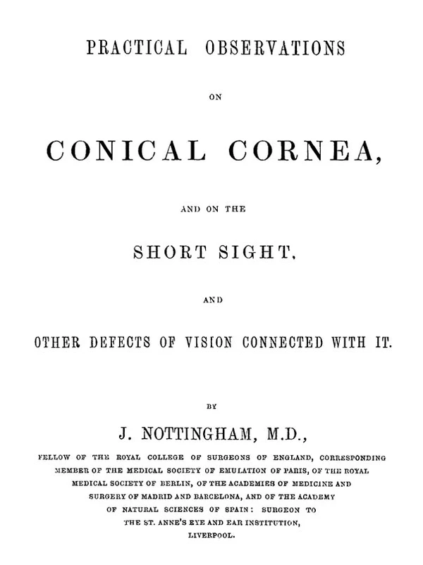 Ещё в 1748 году германский окулист Бурхард Маухарт (Burchard Mauchart) в своей докторской диссертации описал пациента с неизвестной болезнью глаз[3], которую он назвал «staphyloma diaphanum». Однако первое подробное описание кератоконуса, отделившее его от других эктазий роговицы, представил в 1854 году британский врач Джон Ноттингем (англ. John Nottingham).[4] Сообщив об известных ему случаях «конической роговицы», он выделил несколько ставших классическими симптомов: полиопия, потеря прочности роговицы, трудность в подборе очков для пациента[5]. В 1859 году британский хирург Уильям Боумен (William Bowman) для диагностики кератоконуса использовал офтальмоскоп, недавно изобретённый германским врачом и физиком Германом Гельмгольцем[6]. Он описал, под каким углом наклона зеркальца лучше всего видна коническая форма роговицы[6]. Боуман также попытался хирургическим путём восстановить зрение пациента, зацепив радужную оболочку тонким крючком, продетым сквозь роговицу, и стягивая зрачок в вертикальную щель, подобную зрачковой щели у кошек. Он сообщил об успешной операции у 18-летней женщины, которая до того не могла сосчитать количество пальцев с расстояния 20 сантиметров. К моменту появления работы швейцарского офтальмолога Иоганна Хорнера (Johann Horner) «По поводу лечения кератоконуса», название болезни уже было общепринятым[7]. Методы лечения того времени были разработаны под руководством ведущего германского офтальмолога Альберта фон Грэфе. Роговицу прижигали раствором нитрата серебра для восстановления её нормальной формы и прикладывали под плотную повязку ткань, пропитанную вызывающим миоз составом. Изобретённая в 1888 году контактная линза сразу нашла применение в коррекции зрения при кератоконусе. Французский врач Эжен Кальт (Eugène Kalt) создал из стекла склеральную оболочку, сдавливающую роговичный конус[8]. С начала XX века, исследования кератоконуса позволили лучше понять это заболевание и расширить выбор методов лечения.