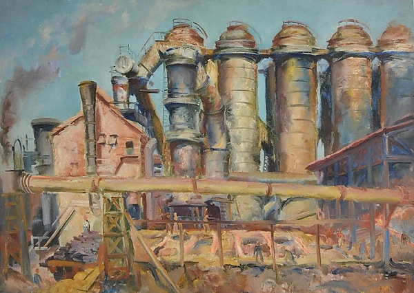 На картине представлен индустриальный пейзаж, в композиции которого слева располагается двухэтажное строение, а справа изображены пять высоких цилиндрических сооружений, соединённых между собой сложной системой трубопроводов. Фоном служит голубое небо, подчёркивающее открытость пространства и структурную чёткость архитектурных форм.