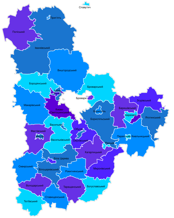 | Др. крупные города | Бровары, Борисполь, Ирпень, Фастов, Вишнёвое, Буча, Боярка, Обухов, Вышгород, Переяслав | ||||