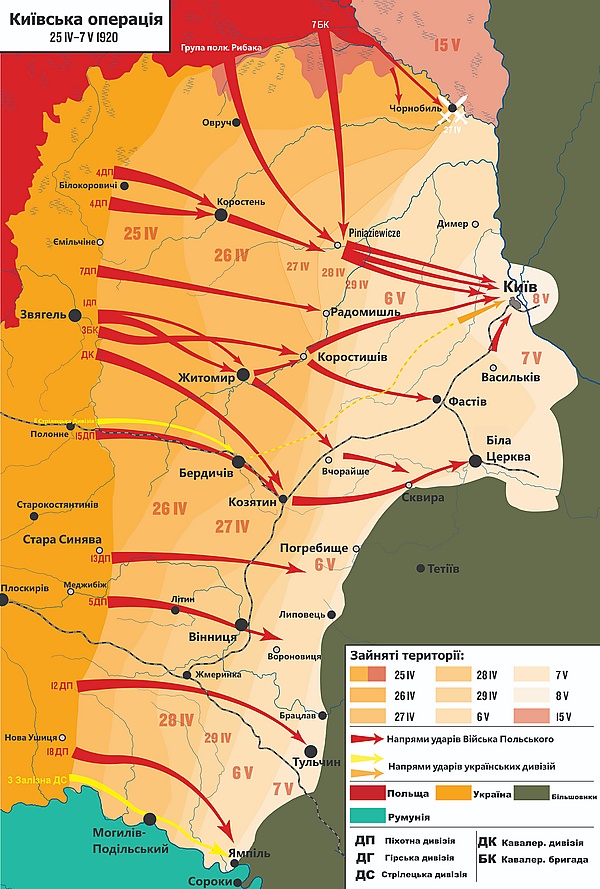 В Житомире Юзеф Пилсудский выступил с обращением к украинскому народу, подтвердив его право на независимость и собственный выбор государственного устройства. Со своей стороны Симон Петлюра подчеркнул незыблемость польско-украинского союза. В эти дни поляки взяли в плен более 25 тысяч красноармейцев, захватили 2 бронепоезда, 120 орудий и 418 пулемётов. 6 мая пала Белая Церковь. В тот же день польские солдаты въехали в Киев на захваченном ими трамвае, взяли в плен одного из красных командиров и уехали. На следующий день части РККА в спешном порядке бежали из города. 7 мая в Киев вступили кавалерийские части Войска Польского (8-го мая вошла пехота). На мосту через Днепр произошла небольшая стычка с арьергардными частями, прикрывающими отход 12-й армии РККА. Прибывшая на место 1-й дивизии легионеров полковника Домб-Бернацкого перешла реку и заняла левобережный плацдарм, протянувшийся на 15 км вглубь позиций противника. Польские потери при взятии Правобережной Украины составили 150 убитых и 300 раненых.